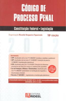 Com as atualizações de 2011 em destaque, este trabalho é indicado para acadêmicos, bacharéis, concurseiros e todos os profissionais que necessitem a pronta consulta da legislação pátria. Contém também - CPP atualizado com a lei nº 12.403/2011 (prisões e medidas cautelares); LEP atualizada com as leis nos 12.433/2011 (remição da pena) e12.258/2011 (monitoração eletrônica); ECA atualizado pela lei nº 12.415/2011 (fixação de alimentos provisórios em favor da criança ou adolescente agredido); lei de proteção a vítimas e testemunhas - atualizada pela lei nº 12.483/2011 (prioridade na tramitação do inquérito e do processo criminal) e decreto nº 7.627/2011 - regulamenta a monitoração eletrônica.